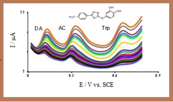 Oxadiazole derivative on multi-walled carbon nanotubes glassy carbon electrode was constructed by electrodeposition of oxadiazole on a MWCNT modified GCE. OMWCNT-GCE exhibits excellent electrocatalytic activity for dopamine oxidation. This modified electrode resolved the overlapping of the anodic peaks DA, AC and Trp.