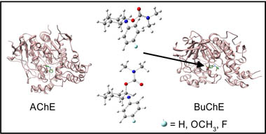 The novel synthesized carbamates are selective inhibitors of the BuChE enzyme. According to molecular docking calculations, the carbamoyl group is close to the key residues of the catalytic triad.