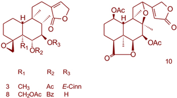 Three new neo-clerodanes, antiscorbuticane A, B and C, and seven known compounds were isolated from the methanol extract of Tinnea antiscorbutica. Antiscorbuticane B exhibited no mutagenic activity and did not induce micronucleus formation in the V79 cell line.