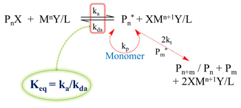 The general reaction mechanism of a typical atom transfer radical polymerization (ATRP) and the definition of equilibrium constant. PnX is the "dormant" polymer, MnY/L is the catalytic system, Pn* is the "living" polymer and Pn+m / Pn + Pm are the "dead" polymers.