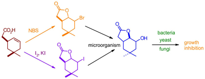 Two lactones (δ-bromo-γ-lactone and δ-iodo-γ-lactone) obtained from γ,δ-unsaturated acid were transformed by hydrolytic dehalogenation carried out by filamentous fungi into hydroxylactone. This hydroxylactone inhibited growth of some microorganisms.