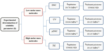 Comparative results obtained by different methods for experimental determination of solubility parameter (δ) of low and high molar mass molecules. UV-Vis and µDSC were suitable to measure δ for a wide molar mass range.