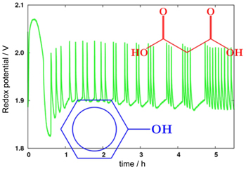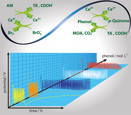 How to cite this articlePhenol added to the classical Belousov-Zhabotinsky reaction drives a bifurcation from regular oscillations to a transient bursting phenomena. It was explained as a complex process that involves a kinetic competition between an aromatic redox cycle of phenolic compounds and the Ce4+/Ce3+ catalytic cycle of the BZ classic oscillator. Details are presented in the Article Bursting in the Belousov-Zhabotinsky Reaction Added with Phenol in a Batch Reactor by Ariel Cadena, Daniel Barragán and Jesús Ágreda on page 2028.