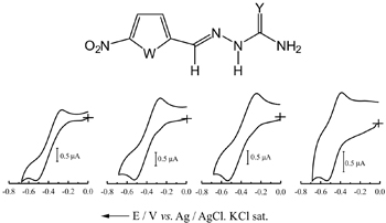 The electrochemical reduction of nitrofurazone and its analogues was studied by cyclic voltammetry, differential pulse voltammetry and chronoamperometry in aqueous medium by using a glassy carbon electrode. The nitro anion radical was generated electrochemically and undergoes a disproportionation chemical reaction. The nitro anion radical obtained using the nitrothiophene thiosemicarbazone (NTS) analogue was significantly more stable than the one from nitrofurazone.