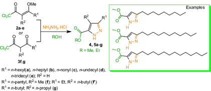 This work describes the synthesis of a novel alkyl 1H-pyrazole-5-carboxylate series from versatile precursors 1,1,1-trihalo-4-methoxy-3-alken-2-ones obtained from long chain ketones. These are promising new oleochemical derivatives.