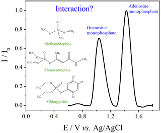 Boron-doped diamond electrode was used to evaluate the interaction of the DNA nucleotides guanosine monophosphate and adenosine monophosphate with the organophosphorus pesticides methamidophos, monocrotophos and chlorpyrifos.