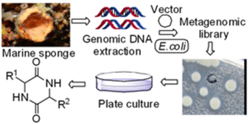 Eleven cyclodipeptides were heterogeneously expressed in plate culture of an antibacterial clone functionally screened from metagenomic library of Japanese marine sponge D. calyx. These cyclodipeptides, two of them containing D-proline residue despite non-NRPS products, were firstly reported from metagenomic library.