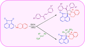 A new series of spiroacenaphthene pyrroloisoquinolines were synthesized by one-pot, three component condensation of azomethine ylides, generated from 1,2,3,4-tetrahydroisoquinoline with acenaphthenequinone by a 1,5-prototropic shift route, with chalcone and nitrostyrene derivatives in a regio- and stereoselective manner.