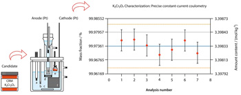 Characterization process for certifying K2Cr2O7 as certified reference material (CRM) by precise constant-current coulometry: from a candidate CRM until a certified value.
