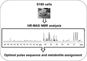 S180 cells, a model of tumor murine for testing drug candidates with potential anticancer activity, were studied by HR-MAS NMR for establishing optimal pulse sequence and metabolite assignment.