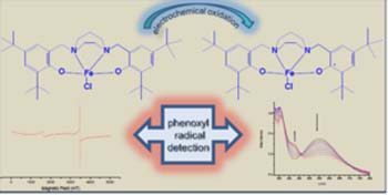 The cover picture shows that after electrochemical oxidation a phenoxyl radical species is formed. The synthesis and evaluation of radical formation of other four iron complexes are also described. The main difference in the structure of the complexes is related with the diazocyclic units of the ligands: piperazine, homopiperazine, hexahydropyrimidine or hexahydropyrimidin-5-ol. Details are presented in the Article Iron Complexes Containing Electrochemically Active Diazocycle-bis(di-tert-butyl-phenol) Ligands by Luísa L. Mendes, Christiane Fernandes, Roberto W. Franco, Leonardo M. Lube, Sheng-Hsuan Wei, Joseph H. Reibenspies, Donald J. Darensbourg and Adolfo Horn Jr. on page 1050.