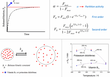 3D hydrogel matrices based on GAm (chemically modified Arabic Gum) and DAAm (dimethyl acrylamide) were prepared on GAm:DMAAm rate 60:40 w:w. Essays of solutes (VitB12 and DFK) release from 3D matrices were performed. The partition-diffusion model allows predicting whole profile of release in any case. It was verified that α/kR ratio is not volume dependent, at a certain temperature, but the temperature strongly influences such ratio for both solutes.