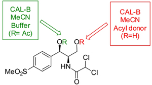 The lipase-catalyzed synthesis of thiamphenicol derivatives has been studied through complementary acylation and hydrolytic approaches, finding Candida antarctica lipase B as the most efficient biocatalyst for the selective modification of both thiamphenicol and thiamphenicol diacetate, respectively.