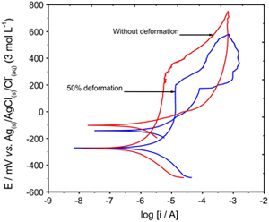 Potentiodynamic polarization curves of the ISO NBR 5832-1 stainless steel with cold deformation (50% reduction in thickness) or without deformation (0%) showing that the cold deformation increased pitting susceptibility of the stainless steel.