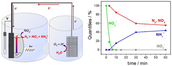 Photoelectrocatalytic reduction of nitrite reached 100% and its conversion involves formation of ammonium ion and nitrogen containing gaseous species by using a two compartment reactor and absence of dissolved oxygen. The procedure is based on UV irradiation of Ti/TiO2 semiconductor biased with more negative potential than their flat band potential.