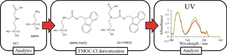 A simple and fast derivatization method for analysis of glyphosate and aminomethylphosphonic acid (AMPA) using UV spectrophotometry.