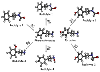 Degradation products of methanolic and aqueous solutions of phenylethylamine (left) and tyramine (right) by gamma radiation at 5kGy.