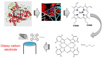 Modification of glassy carbon electrode with MWCNT-COOH and copper phthalocyanine complex, which is responsible for imitating the active site of the P450 enzyme, iron protoporphyrin IX.