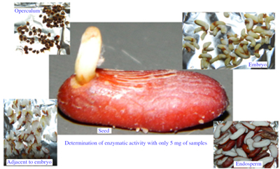 A new spectrophotometric method was developed to determine the enzymatic activity of endo-β-mannanase. A key advantage of the method is that it can be performed with only 5 mg of germinating seeds and hence different parts of the seed can be quickly and efficiently assessed.