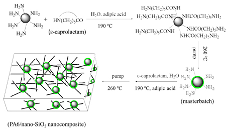 A reactive polyamide 6 (PA6)/SiO2 masterbatch containing 20% (mass fraction) of nano-SiO2 was used as a filler to prepare polyamide 6/SiO2 nanocomposites. The as-prepared nanocomposites with 0.5% nano-SiO2 content presented the best mechanical properties.