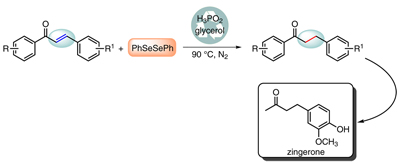 Reaction of in situ generated benzeneselenol with various (E)-chalcones using glycerol as solvent, gave β-selanylcarbonyl compound or chemoselective 1,4-reduction products, depending on the amount of benzeneselenol employed and the nature of (E)-chalcone. The glycerol/H3PO2 system can be easily recovered and reused in chemoselective 1,4-reductions and the natural product zingerone can be synthesized in good yield.