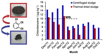 The technique of solid-liquid extraction with purification at low temperature was used in the monitoring of sewage sludge samples collected within the period of 11 months. The 1,2,3-trichlorobenzene was quantified in concentrations higher than the maximum residue limit for chlorobenzene in soil amended with sludge.