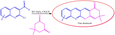 An efficient process for synthesis of pyranoquinolines via Knoevenagel condensation then the ring closures through an addition-elimination reaction of readily available 2-chloroquinoline-3-carbaldehydes with dimedone was reported. On the other hand, NICS values were used as quantitative measures for the relative aromatic character in pyranoquinolines. The results show that NICS for phenyl group of pyranoquinolines are less than that for benzene.