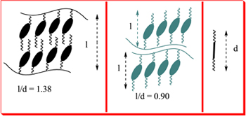 Structure of smectic C (SmC) mesophase determined by X-ray analysis of polymer tetrazoles poly-{4-(2-nonyl-2H-tetrazol-5-yl)phenyl 4-[(propionyloxy)butyloxy)]}benzoate (left) and poly-{4-(2-nonyl-2H-tetrazol-5-yl)phenyl 4-[(propionyloxy)undecyloxy)]}benzoate (right).