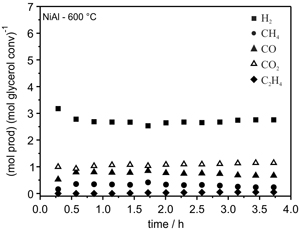 Catalytic activity of NiAl at 600 ºC. This catalyst gave the best results for GSR under the test conditions, proving stable and active throughout the 4 h reaction time.