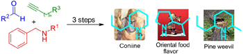 The graphical abstract pictorially represents the three-step synthesis of three cyclic alkaloids (coniine, an oriental food flavor and a natural product extracted from Pinus ponderosa) prepared from commercially available starting materials. The key step was the A3-coupling reaction.