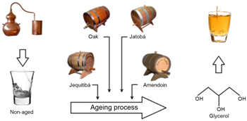 A new high performance liquid chromatography with diode array detection methodology was developed for glycerol analysis in sugar cane spirit and applied to selected set of cachaças. Glycerol contents in aged cachaças were about 10-fold higher than in non-aged cachaças.