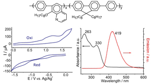 Novel highly soluble photoluminescent macromolecule having n-type conjugated segment and presenting low-lying LUMO level, ionization potential (IP) and electron affinity (EA) of 6.25 and 3.65 eV, respectively.