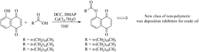 In this work fatty esters derived from Juglone were synthesized by modified Steglich esterification. Compounds prepared showed promising results as wax inhibitors on crude oil.