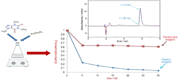 Caffeine degradation was evaluated at an initial concentration of 5.2 µmol L-1 (1000 µg L-1) employing low iron and hydrogen peroxide concentrations. The Fenton and the Fenton-like processes were investigated. The effects of inorganic ions on caffeine degradation were evaluated, as well as chronic toxicity of the reaction condition in which there was higher caffeine degradation by Fenton's reagent.