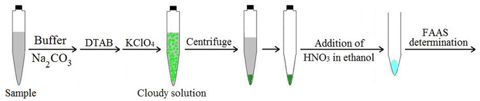 In the present study, a cationic surfactant with a proper alkyl group side chain is dissolved in the aqueous sample and then a proper ion-pairing agent is added. Due to the interaction between the surfactant and ion-pairing agent, very fine solid particles are formed and precipitates of analyte are adsorbed on the surface of solid particles and dissolved in HNO3 in ethanol, and then aspirated directly into the flame of the atomic absorption spectrometer (AAS).