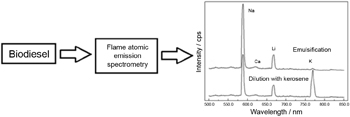 The simultaneous determination of Na, Ca and K in biodiesel was performed by flame atomic emission spectrometry using a continuous electromagnetic radiation detector and two different sample preparation procedures: direct dilution with kerosene and emulsification using HNO3, n-butanol and Triton X-100.