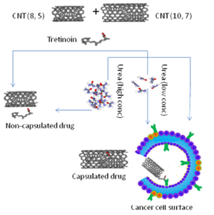 This work explains how the size of a carbon nanotube, urea, and temperature would influence the insertion of Tretinoin, a skin anti-cancer drug, into carbon nanotubes.