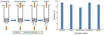 A schematic representation of the solid phase extraction of metribuzin by using hydrophilic-lipophilic balance (HLB) cartridge and recovery amounts (%) of metribuzin by different methods. The solid phase extraction method with HLB cartridge had the highest metribuzin recovery.