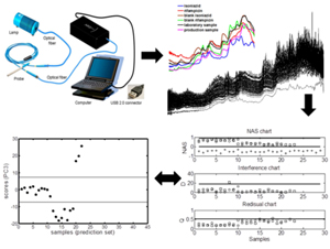 In this work, we used near infrared reflectance spectroscopy and multivariate control charts based on significant principal component (PC) scores and net analytical signal (NAS) for simultaneous quality monitoring of isoniazid and rifampicin in a pharmaceutical formulation.