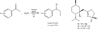 Chiral β-hydroxy-2-oxazolines were synthesized and evaluated as catalysts for the addition of diethylzinc to aldehydes and were effective in obtaining the addition products, with enantiomeric excess up to 78%.