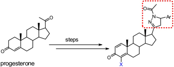 Eight steroids-based pyrazolinyl derivatives were synthetized by several steps and the compound where Ar = ph exerted marked insecticidal activity, comparable to that of the natural product insecticide celangulatin V.
