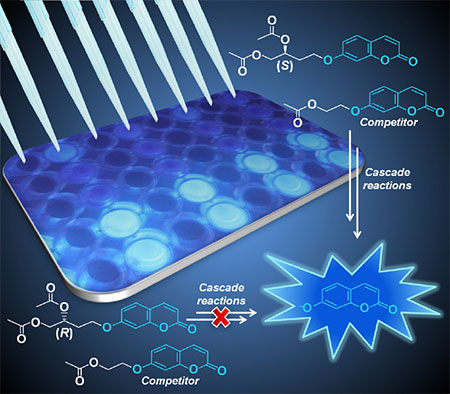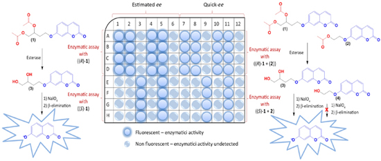 High throughput screening techniques (HTS) are fast and efficient alternatives to evaluate enzymatic activities. Here, this technique is applied to obtain enantiomeric excess and conversions values with chiral fluorogenic probes and a non fluorogenic competitor, which was named Quick-ee. The fluorescent signal reveals of the enantioselectivity of the enzyme. Details are presented in the Article High Throughput Enzymatic Enantiomeric Excess: Quick-ee by Maria L. S. de O. Lima, Caroline C. da S. Gonçalves, Juliana C. Barreiro, Quezia Bezerra Cass and Anita Jocelyne Marsaioli on page 319.