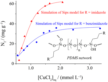 Functionalized elastomeric networks with imidazole or benzimidazole functional groups, derived from poly(dimethylsiloxane), were able to absorb copper(II) from aqueous solutions. The metal removal proceeded in accordance with the Sips adsorption model.