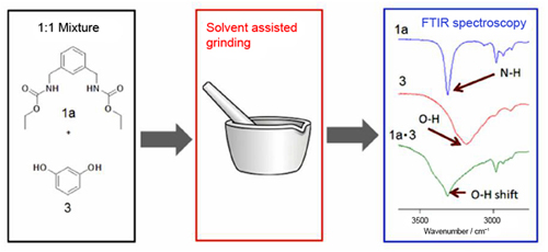 Mechanochemical complexation of phenylenebis(methylene)dicarbamates and benzenediols confirmed by Fourier transform infrared spectroscopy.