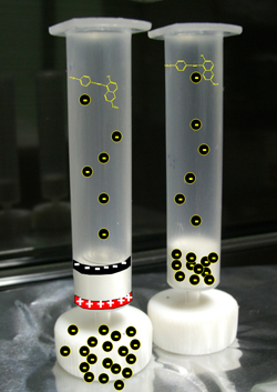 Comparison of elution efficiency of the anionic model compound (sunset yellow) using conventional solid phase extraction (right cartridge) and electric field-assisted solid phase extraction (left cartridge).