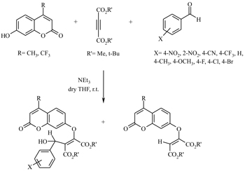 Novel coumarin derivatives have been synthesized in good yields by three-component reactions of 7-hydroxy coumarins, dialkyl acetylenedicarboxylates and aromatic aldehydes in the presence of NEt3 under mild reaction conditions.