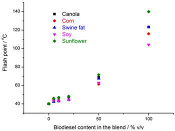 There is a clear correlation between the biodiesel quantity in a diesel-biodiesel blend and its flash point. This means that the experimental determination of a flash point temperature also provides information regarding the biodiesel content of diesel-biodiesel blends.
