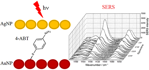 Intercalated 4-aminobenzenethiol between gold and silver nanoparticles was prepared and its surface-enhanced Raman scattering (SERS) signal is dependent on sandwiched nanostructure.