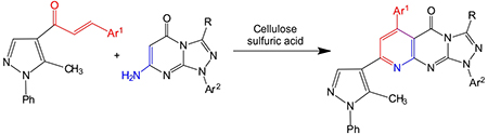 In the present work, novel procedure for synthesis of pyrido[2,3-d][1,2,4]triazolo[4,3-a] pyrimidin-5-ones has been reported by using cellulose sulfuric acid as biopolymeric solid support acid catalyst.