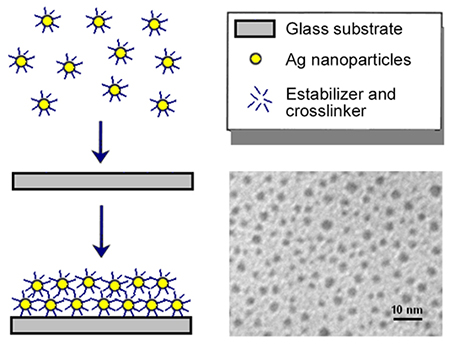 One step deposition of thin films containing silver nanoparticles on glass surfaces was made using charged silsesquioxane as nanoparticle stabilizer and as crosslinking agent. The system showed antimicrobial activity and it is promising as coating for glass used as food package and for hospital instruments that require sterilization.